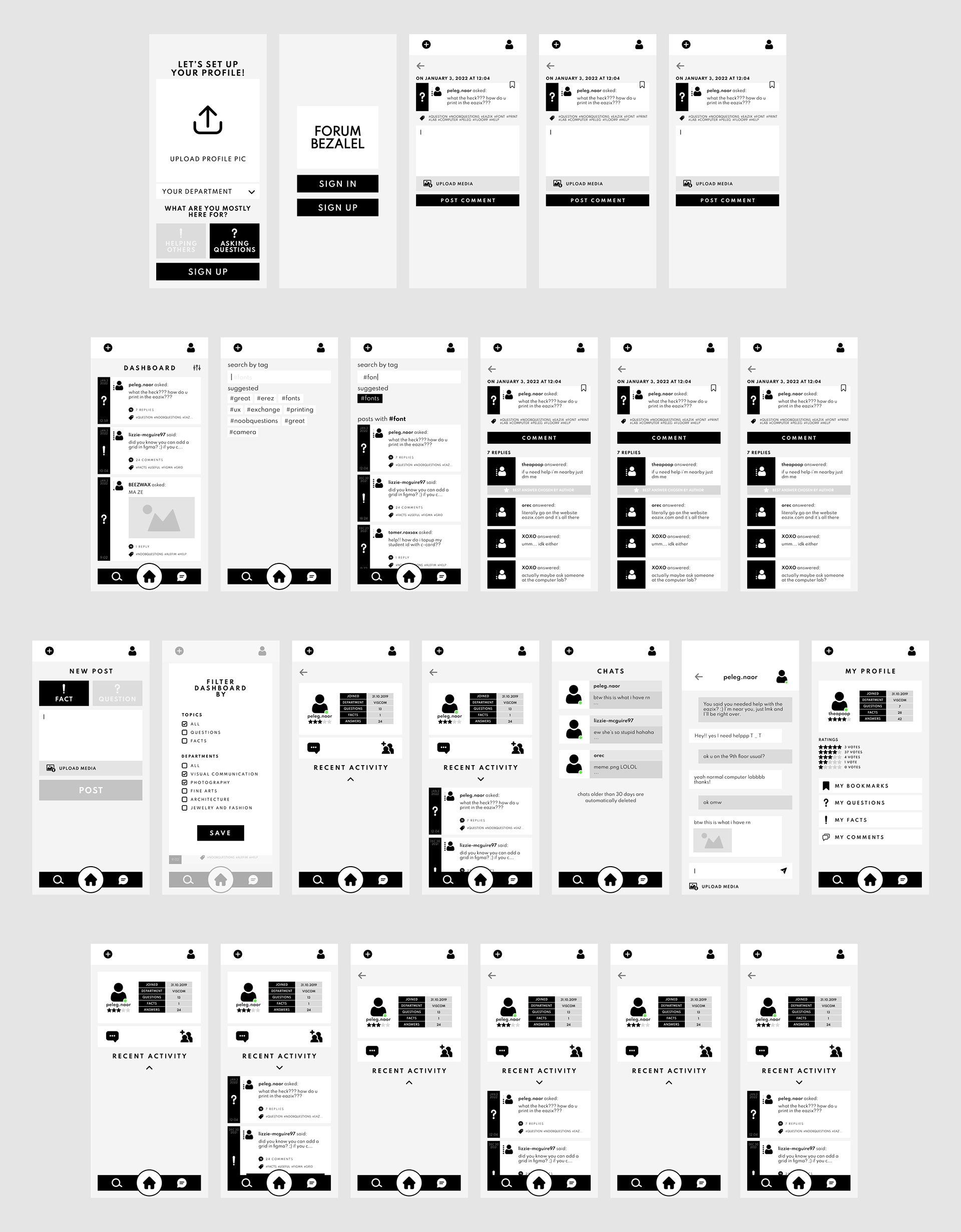 Wireframe skeletons for hypothetical app for Bezalel University for getting help to and from students.